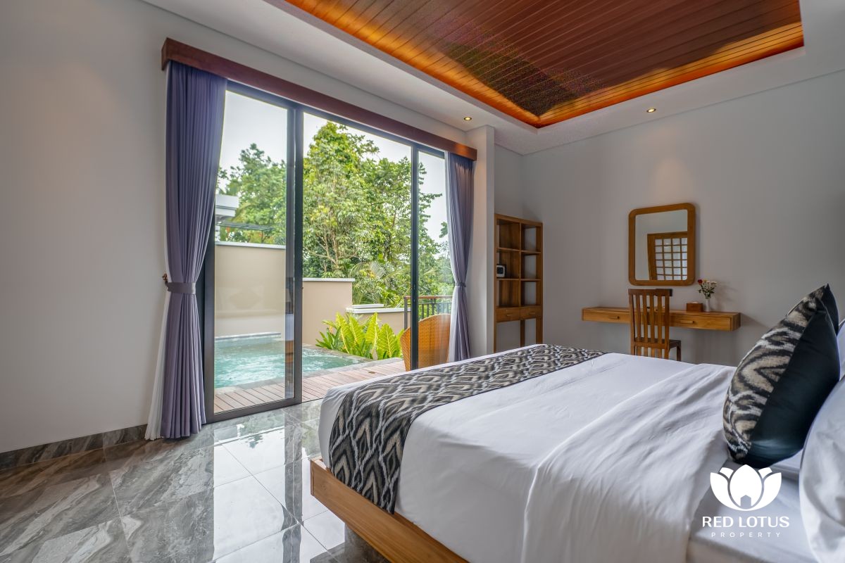 The Ubud Villas Rental property are offers two separate private villas for extra privacy. A spacious 2-bedroom unit and a cozy 1-bedroom unit, each with its own private swimming pool nestled among the trees. The larger unit has a nicely proportioned pool perfect for relaxed swims. While the smaller one offers a more intimate dip with jungle views all around. Both units include a full kitchen and a dedicated dining area, so you can cook simple meals or enjoy casual dining with the sounds of nature as your backdrop. The bedrooms are comfortable with private bathrooms, and you’ll find a smart TV plus WiFi coverage throughout for easy evenings in.