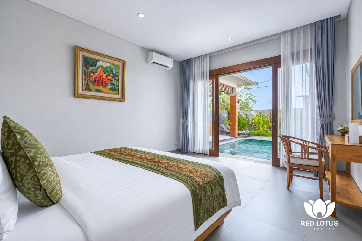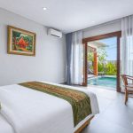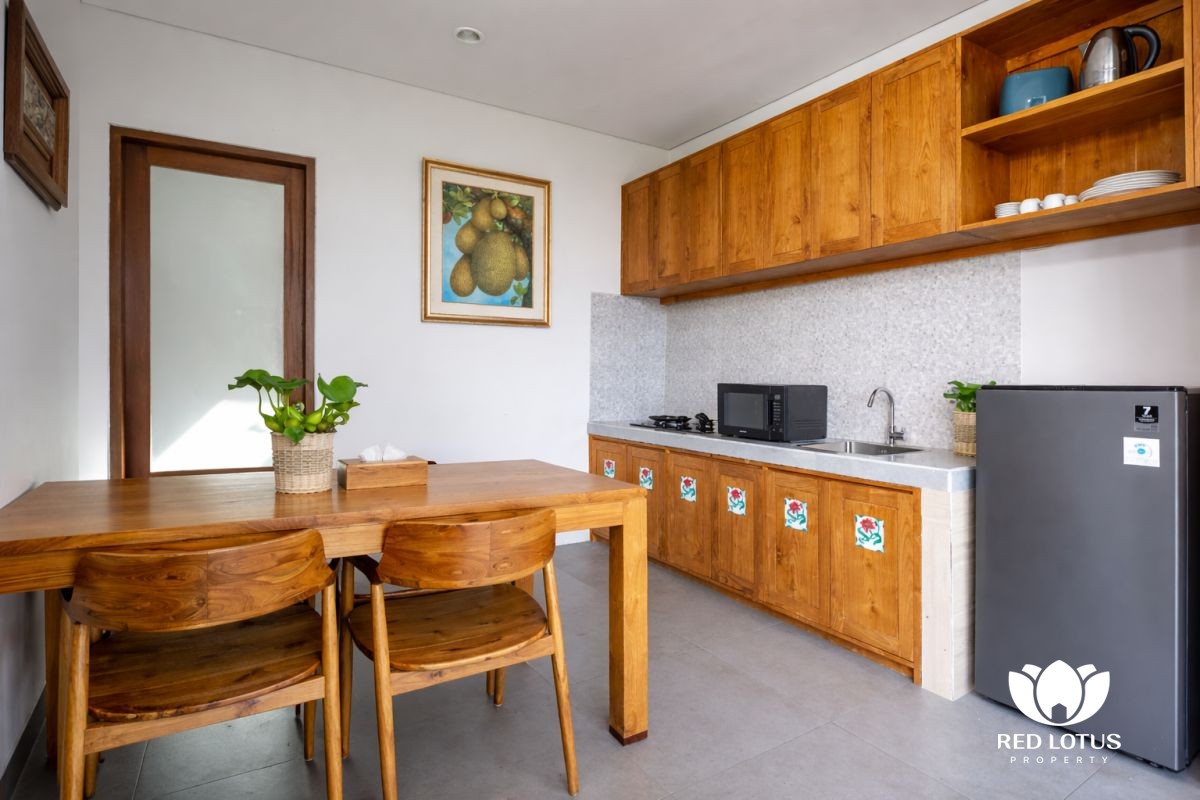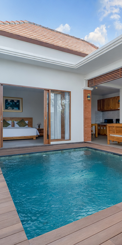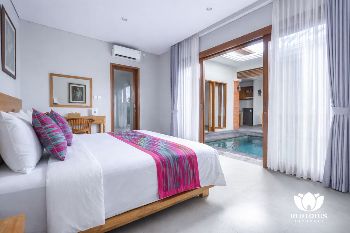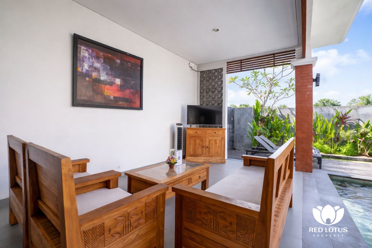 The design leans into a warm, home-style feel with a touch of elegance, creating a comfortable place to unwind after a day out in Ubud. At the center, a private swimming pool adds a refreshing touch—ideal for slow mornings with coffee, relaxed afternoons by the water, or simply enjoying the calm surroundings.