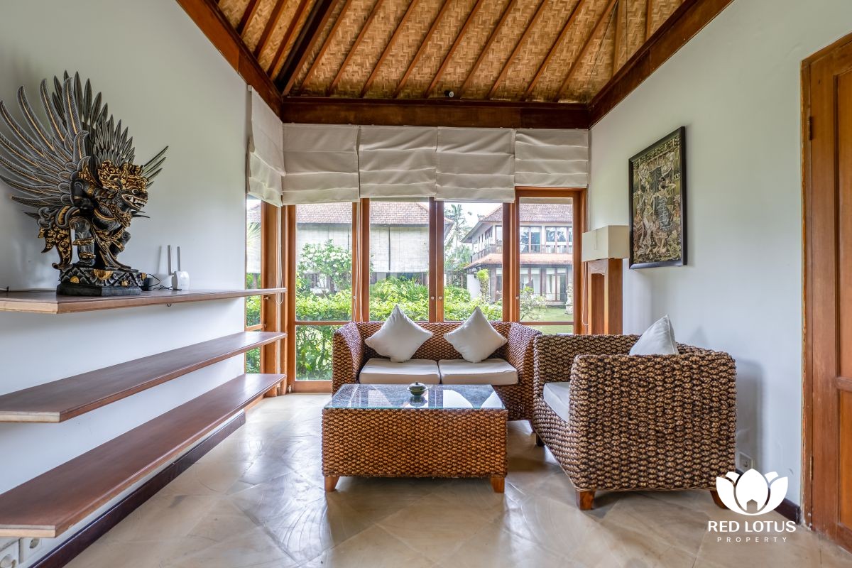 Nestled in the picturesque sub-district of Ubud, this private villa Ubud offers the perfect blend of natural beauty and architectural elegance. The half-open design of the main building seamlessly integrates with the meticulously manicured gardens, creating a serene and refined ambience. This open-air building serves as the main space for living, dining, and the kitchen, with the staff area located in the back.